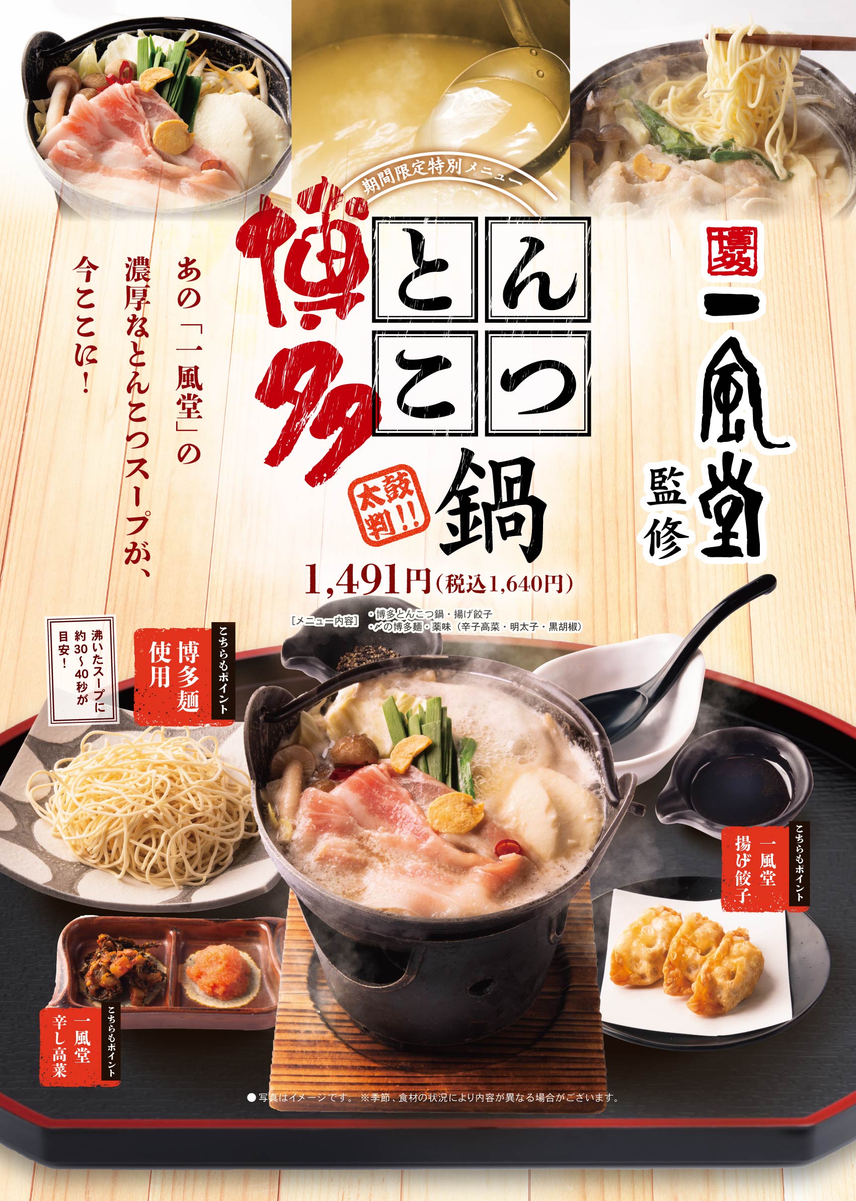 一風堂のとんこつスープを使用した冬にぴったりの小鍋に、「餃子」「明太子」「辛子高菜」も一風堂オリジナルの食材を使用しその世界観を忠実に再現しました。